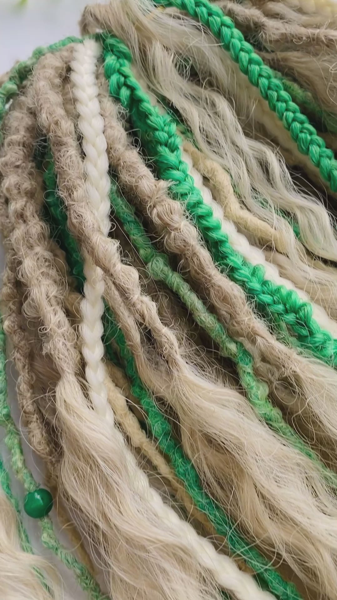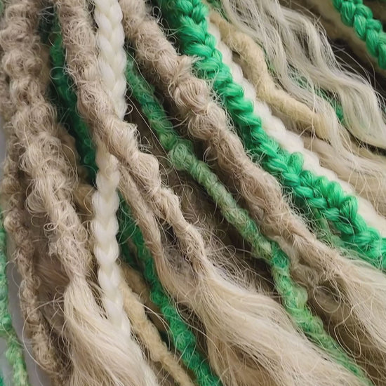 Step into a forest-inspired, elven look with this handmade synthetic dreadlock set in soft blonde and fresh green tones.