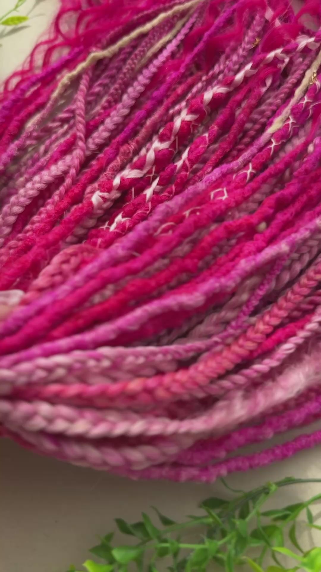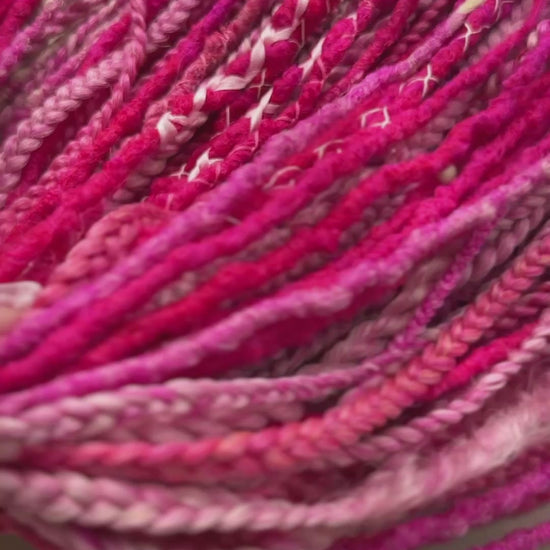 Handmade synthetic dreadlock full set in vibrant shades of magenta, fuchsia, blush pink, and soft cream.