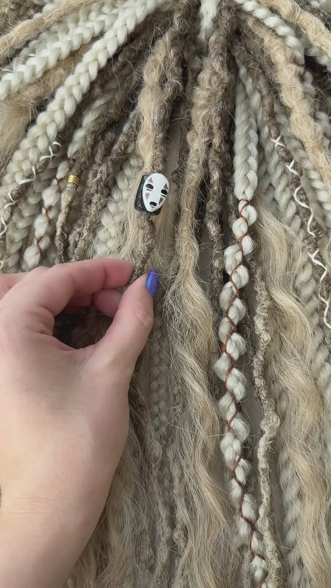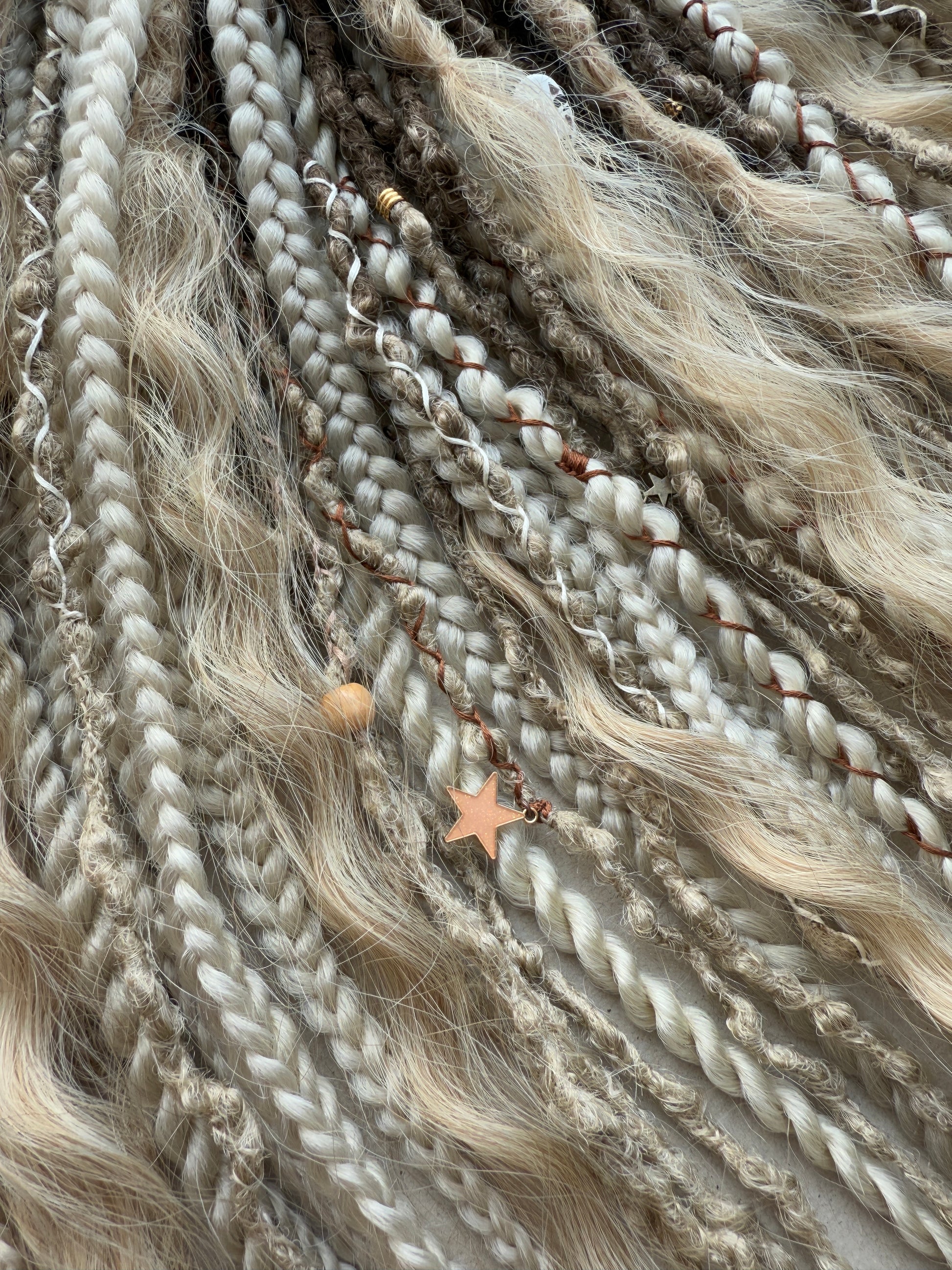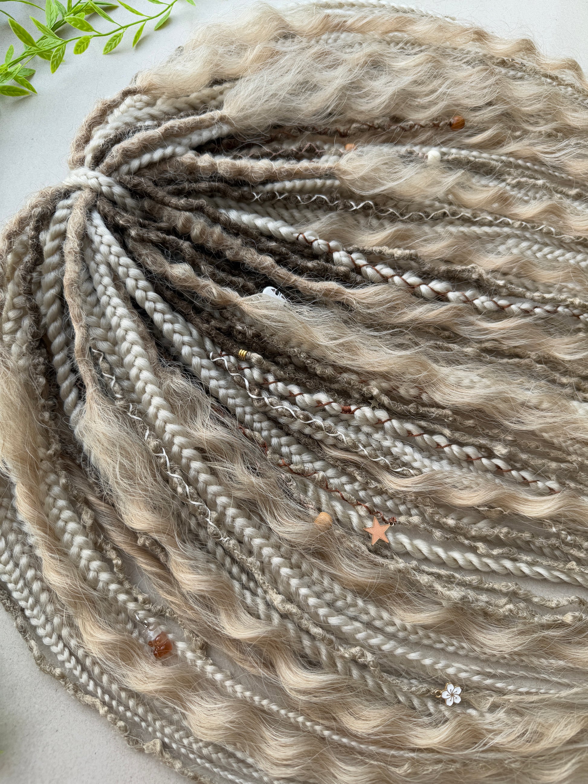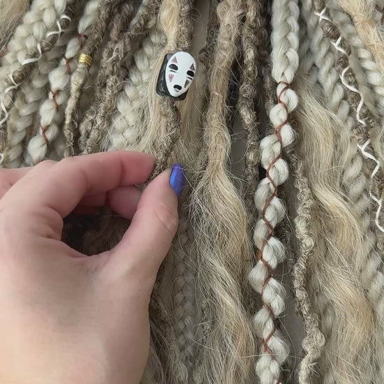 This handmade set blends dreads, braids, and gentle waves for a light, airy look. Decorated with threads, wooden and star-shaped beads, and a handmade polymer charm (No-Face bead), each detail adds quiet magic without overload.